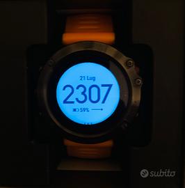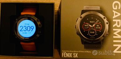 Garmin Fenix 5X Sapphire Crystal(schermo in zaffiro). Tenuto in maniera maniacale. Perfettamente funzionante, durata batteria ottima, 10 giorni circa senza allenamenti, 7 giorni circa con 2/3 allenamenti. Qualche leggerissimo segno di usura sul quadrante ma lo schermo è perfetto. Viene fornito con scatola originale e cavo di ricarica. Quadrante senza tasto 50mm circa Solo display 40mm. Colore cinturino arancione.