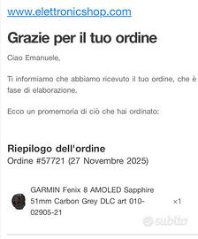 Vendo Fenix 8 Sapphire Amoled comprato 5 mesi fa 27 novembre 2025 quindi fino a novembre 2027 in garanzia! Vetro zaffiro quindi antigraffio indistruttibile (Costa 1300 in negozio…) Scatola accessori e tutto il suo corredo originale regalo due cinturini aggiuntivi a strappo comodissimi! Piccolissimi segni di normale utilizzo ma cambio per passaggio a Apple Watch Allego regolare ricevuta di acquisto in negozio per la residua garanzia di 1 anno e mezzo!