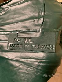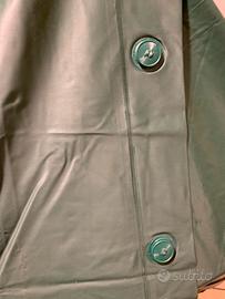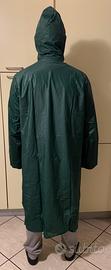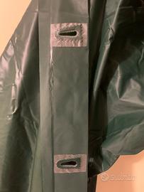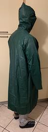 Giacca antipioggia molto robusta. Colore verde militare. Mai usata ma senza confezione o cartellino. Comoda con bottoni in gomma, ideale per trekking e città. Due tasche e cappuccio. Taglia XL.