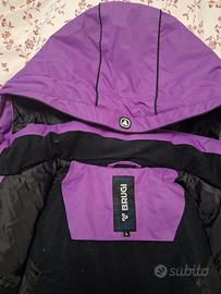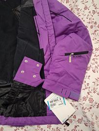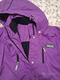 Colore viola, modello tecnico con zip impermeabili, tasche multiple, chiusura a doppia zip e automatici, polsini e vita regolabili e cappuccio staccabile.