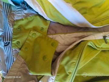 Giacca da sci donna The North Face, verde acido, taglia M (46). 1 tasca interna con cerniera, 1 sacca interna senza cerniera, 1 taschino su manica sinistra per Sky pass e pulisci occhiali , 1 taschino alto esterno con cerniera e altre 2 tasche esterne laterali con cerniera di cui la destra inutilizzabile.