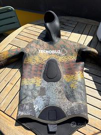 Vendo giacca Tecnoblu liscia mimetica 7 mm con rinforzo sternale, la muta ha un piccolo taglietti in basso sul laterale totalmente riparato, caldissime ed elastica ottima occasione , vendo solo perché’ un po’ stretta per le mie misure