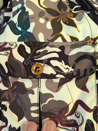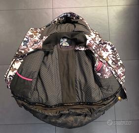 Vendo un giubbotto invernale da sci o snowboard imbottito con un motivo mimetico floreale.