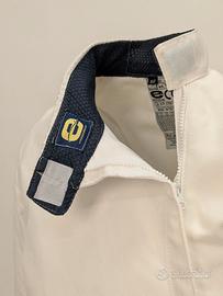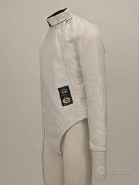 Giacca da scherma Eurofencing modello BASIC FIE 800N, taglia 52 uomo, versione per destri. Certificazione FIE 800 Newton, livello 2 >800NW, conforme alla normativa EN 13567+A1 (2007), omologata per competizioni ufficiali. Modello BASIC a doppio strato, struttura robusta e affidabile, indicata per agonismo e gare federali nelle tre specialità: fioretto, spada e sciabola. Taglia 52 uomo come da etichetta interna: statura 165–169 cm, giro torace 98–102 cm, giro vita 82–88 cm. Composizione esterno 88% poliestere, 12% cotone; interno 100% cotone. Made in Italy. Condizioni ottime, senza difetti. Prezzo di listino 155€.