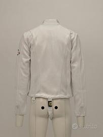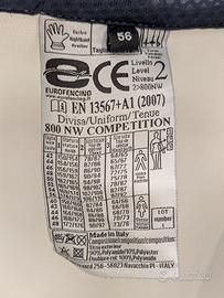Giacca da scherma Eurofencing modello Competition FIE 800N, taglia 56 uomo, versione per destri. Certificazione FIE 800 Newton, livello 2 >800NW, conforme alla normativa EN 13567+A1 (2007), omologata per competizioni ufficiali nazionali e internazionali. Realizzata in tessuto elasticizzato monostrato (90% poliammide, 10% poliestere), Made in Italy, con chiusura laterale a zip e rinforzo interno al collo. Utilizzabile per fioretto, spada e sciabola. Taglia 56 uomo come da etichetta interna: statura 174–179 cm, giro torace 106–110 cm, giro vita 87–92 cm. Presenti personalizzazioni stampate: logo “Picca Garin” sul petto e “Gli Autogol” sulla manica. Mai utilizzata in allenamento o gara. Presente un leggerissimo alone su una manica, visibile solo in determinate condizioni di luce, probabilmente dovuto allo stoccaggio e verosimilmente removibile con lavaggio delicato; non incide su struttura o prestazioni tecniche. Prezzo di listino 245€.