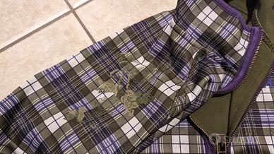 Vendo giacca da donna HELLY HANSEN,adatta per trekking,sci. Tessuto Wind stopper ,fodera in pile interna. Colori scozzese bianca/verde oliva/viola.