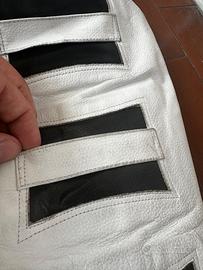 Giacca in vera pelle da moto con protezioni su spalle, gomiti e schiena. Inserti in vera pelle, scritte ricamate e zip ykk della migliore qualità.