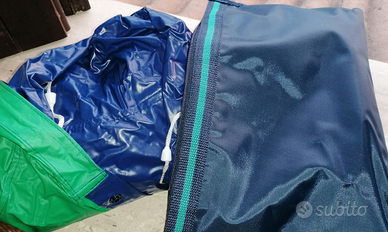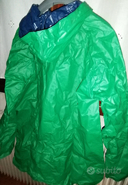 Vendesi giaccone in pvc/vynil da uomo, tg XL, impermeabile, colore verde con interno blu, con cappuccio, con astuccio contenitore con cerniera, mai utilizzato, no spedizione, consegna diretta zona Casello Treviso Nord