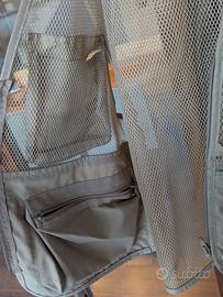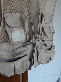 Gilet da pesca estivo, marca Mustad, taglia XL. Oltre alle numerose tasche esterne, presenta due capienti tasche interne e patch per le esche da mosca.