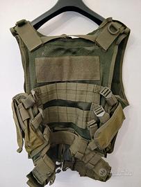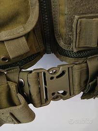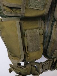 Gilet tattico colore verde scuro, perfetto per softair, survival, escursioni o attività outdoor. Taglia unica regolabile con cinturini laterali, dotato di numerose tasche e chiusure resistenti. Usato pochissimo, pari al nuovo.