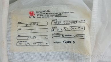 Vendo parapendio Gin Yeti S in buone condizioni ma con test check scaduto, quindi utilizzabile per campetto scuola, ground handling, gonfiaggi oppure come vela da battaglia per volare sulle dune. La vela è ancora in ottime condizioni perchè è stata usata molto poco e il tessuto è ancora croccante. Dati tecnici sulla vela: - Classe EN-A / DHV1 - Taglia S - Peso in volo 70-85kg - Superficie 23,59 m2 - Bretelle in dynema (dynema risers) - Anno 2007 - Tipologia: vela leggera da montagna progettata per l'Hike & Fly. Disponibile per visione e consegna in zona Bassano, Valdobbiadene, Revine, San Gallo.