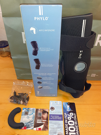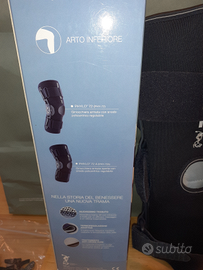 Vendo ginocchiera armata in tessuto traspirante phylo, con foro rotuleo e cuscinetto stabilizzatore orientabile a 360°. dotata di snodi policentrici regolabili in flesso-estensione, fasce di chiusura con pinzetta regolabile e rete posteriore per un maggior comfort.