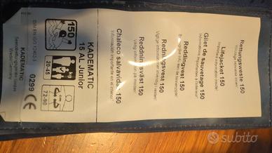 Giubbetto autogonfiabile Kadematic 15 AL Junior per bambini/ragazzi 20-45 kg. Mai attivato. Pastiglia integra e cartuccia presente. La versione attuale nuova costa 110 euro. Cedo perché ormai il figlio è cresciuto. Per sicurezza consiglio l’acquisto di un kit di riarmo, facilmente reperibile online (circa 30-40 euro).