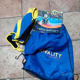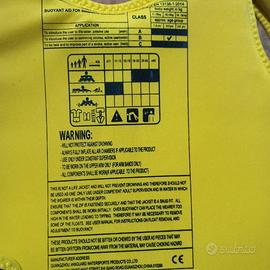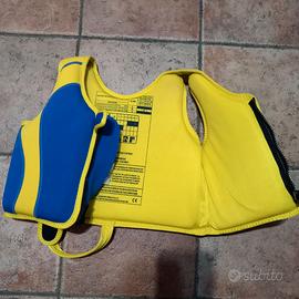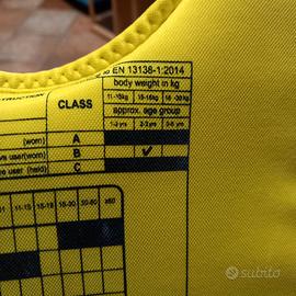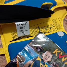 Giubbino salvagente. usato 5 volte. adatto per bambini di 2 . 3 anni e peso fino 15. 18 kg. con cintura regolabile da passare in mezzo alle gambe. Compreso di sacca porta giubbino. Sicuro. interno liscio senza rigonfiamento. marca kwality