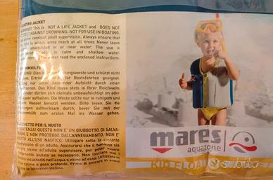 Giubbotto per nuoto e galleggiamento MARES Italy, totalmente nuovo, mai usato o indossato, ancora in confezione originale a valigetta, per bambini di 6 - 9 anni e fino a 30kg. Pagato 30 euro.