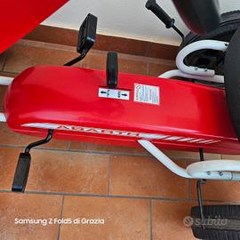 Il go-kart funziona a pedali, ha il freno e il sedile è regolabile, ha anche la ruota di scorta.