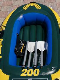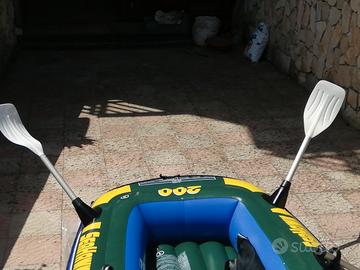Vendesi canotto gonfiabile Seahawk 200 con tre camere d'aria, mai utilizzato. Dotato di due remi, 2 supporti per canne da pesca uno per lato, 1 borsa porta attrezzi, fune da appiglio, 2 supporti rotazionali per remi, un maniglione a poppa. Dimensioni: 200 x 100 cm.