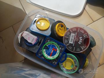 3 contenitori come da foto con piombi varie gr e dimensioni e firma,girelle,ami,bobine,slamatori etc etc..molti ancora nuovi quanti pezzi indefinita ma davvero elevata.