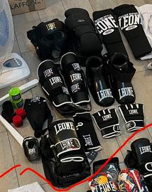 Guanti da box kick thai karatè leone tutto nuovo mai usato 4 fasce 2 guanti 10oz , 2 paratibie l leone , paratesticoli, casco leone , tunica karatè uomo e bambino , pettorina bambino junior guanti leone 4oz 6oz eoba cerchiata rosso da bambino sopra in blu adulto taglia l