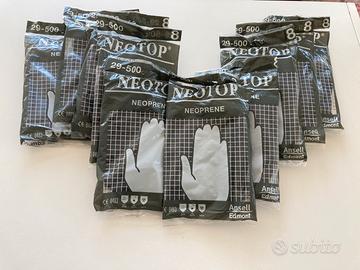 10 paia di guanti in neoprene “Neotop”. Adatti anche alle basse temperature. Taglia 8, colore nero. Nuovi, in confezione integra ed originale.