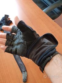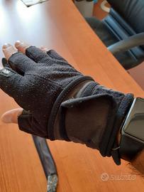 Guanti da palestra Decathlon con dita scoperte e fascia lunga per supporto polso/avambraccio. Usati, con segni di usura visibili (vedi foto), ma ancora funzionali per allenamenti leggeri, home workout o come ricambio economico.