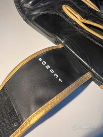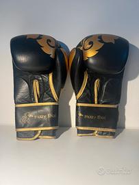 Guantoni da Boxe Leone 1947 Thai Style GN114 in pelle di bufalo nera con dettagli dorati, progettati specificamente per la Muay Thai.