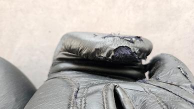 Guantoni utilizzati per kick boxing. Pelle sulla punta delle dita deterioirata dal tempo