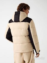 Piumino da sci originale Guess con un design a blocchi di colore beige e nero. Perfetto per viaggi invernali o in montagna, è un capo tecnico, impermeabile e antivento.