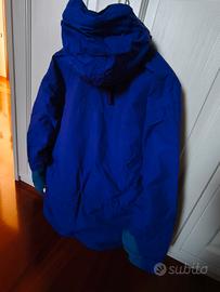 Guscio della Patagonia colore viola con inserti blu taglia M, veste abbondante. Regolabile sia nel fondo che nella vita. Cappuccio regolabile a sua volta. 4 tasche anteriori e tasca interna. Ottime condizioni, unico piccolo difetto manca un bottone automatico nella pattina che copre una tasca, vedi ultima foto.