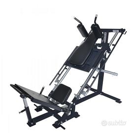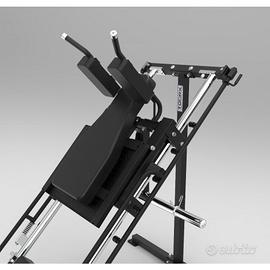 Hack Squat / Leg press della linea Toorx Chrono Pro Line con in dotazione le maniglie con funzione fermi di sicurezza su entrambe le posizioni di allenamento, 2 ganci per fasce elastiche, piedini in gomma anti scivolo, sistema di carico dischi ø50 mm e 25 mm di facile accesso sotto al carrello.