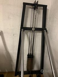 Misure: altezza 210, larghezza 90, lunghezza 230 A catena, carrucole revisionate, pacco pesi, pedana regolabile . Ritiro a mano, una volta smontato passa da una porta normale quindi si può smontare Tenuto bene, solo il rivestimento e’ scolorito, ma il suo lavoro lo fa egregiamente