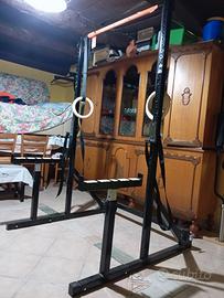 Dotato di pin di sicurezza regolabili e sbarra per trazioni.