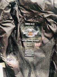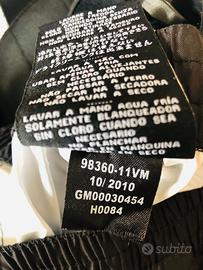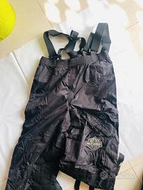 Giacca fantastica con bande catarifrangenti, tasche intere ed esterne chiusure lampo con banda antivento con velcro. Realizzata badando ai particolari più importanti come la chiusura dei polsini. Inclusi i pantaloni con salopette, apribili completamente sui lati con doppia cerniera per indossarla senza togliere gli stivali, tasche e regolazioni in vita. Se piove molto l'acqua che si ferla sulla sella tra le gambe filtrava all'interno e per questa ragione è stata nastrata con nastro americano ma solo la giacca vale molto più del prezzo chiesto.