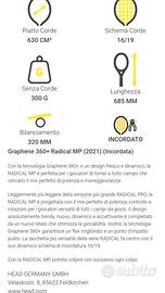 Vendo Head Radical MP dal 2021 per cambio modello. Caratteristiche: •manico 3 •piatto corde 630 cm² •peso 300g •bilanciamento 320mm •schema 16/19 Riporto anche in foto (6) le caratteristiche del prodotto e la descrizione come citato dal sito Head. Racchetta utilizzata a livello amatoriale (circa 45 ore) con tipici segni di usura dovuti al gioco. Riporto in foto ogni segno di imperfezione per correttezza. Prezzo trattabile.