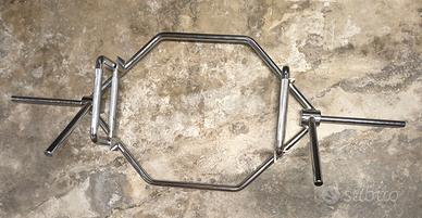 Vendo hex bar (o trap bar) in acciaio cromato, perfetta per l'allenamento a casa o in palestra. Questo attrezzo è ideale per eseguire stacchi da terra (deadlift), shrugs e altri esercizi che mettono meno stress sulla schiena rispetto al bilanciere tradizionale.