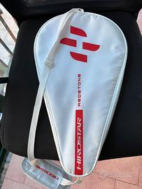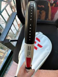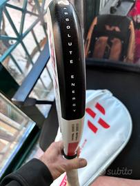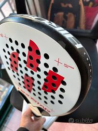 Pala acquistata nuova e usata molto poco. Peso 355g nuda. Con overgrip supera di poco i 360g. Qualche salto di vernice come si vede in foto. Il prezzo tiene conto di questo piccoli difetto solo estetici.