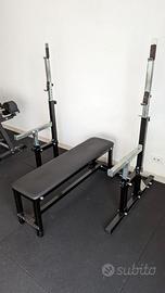 Rack da 300 kg di portata (120×101×140 cm, 55 kg) con panca piana fissa IPF-compliant. Struttura solida, verniciatura intatta, imbottitura integra. 4 anni di uso regolare.