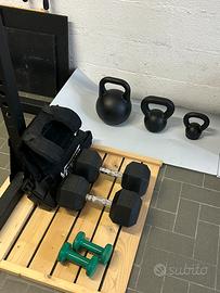 Svendo per inutilizzo Home gym completa KingsBox. Ottime condizioni. 1. Royal squat rack sx-15 ii (inclusa barra trazioni pullup): nuovo 548.47 euro, chiedo 250. 2. Queens bar olympic barbell - bearing: nuovo 227.2 euro, chiedo 100. 3. Bumper Plates 2x5kg-2x10kg-2x15kg-2x20kg: totale circa 515€ di dischi, chiedo 300 euro per set completo. 4. 2x Manubri (Crossfit) KingsBox HEX DUMBBELL da 20kg: nuovi 95.34€ luno, chiedo 110€ per la coppia. 5. Xenios Vest Giubbotto Tactical (Gilet Zavorrato) da 9kg: nuovo 229,01€, chiedo 110€. 6. Kettlebell: 2 da 12kg a 25€ luno e 1 da 4kg a 15€.