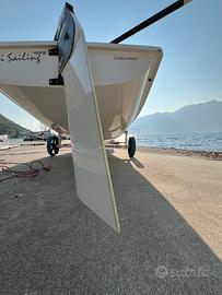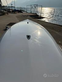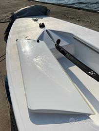 La barca è completa di doppia alberatura in carbonio, timone e deriva usati tre mesi, boma, e vela da regata; doppio telo, armatura di ottima qualità (tutte le cime ottime, bozzelli vari pure e cinghie zihck grip nuove, stecche nuove e barra del timone + stick nuovi in carbonio)