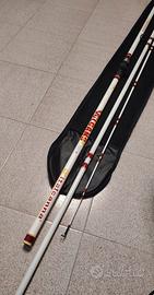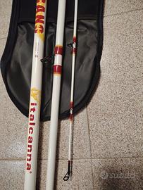 Italcanna Vulcano 250gr 4,5mt. La canna Vulcano è un modello in tre pezzi con innesti interni, progettata per offrire un equilibrio ideale tra potenza e facilità d’uso. Realizzata in carbonio alto modulo, garantisce ottime performance di lancio con azione ripartita, risultando particolarmente adatta a tutti gli stili di lancio da pesca, eccetto ground e pendolare. Gli anelli sono posizionati strategicamente nei punti in cui possono offrire il massimo rendimento, assicurando stabilità durante l’utilizzo e prevenendo rotazioni indesiderate. ATTENZIONE: Usata solo quattro volte praticamente è nuova Prezzo trattabile