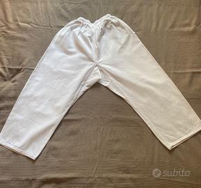 Giacca e pantaloni da judo (judogi) in cotone bianco, modello leggero. Tessuto resistente ma comodo. La giacca presenta lacci interni ed esterni per una chiusura sicura; i pantaloni presentano elastico in vita assieme al laccio.