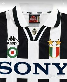 Maglia storica Juventus con la quale la juventus vinse la champions league nella stagione 1995-96. Logo Kappa e stellericamati. Sponsor Sony stampato nel tessuto.