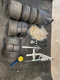 Vendo causa inutilizzo completo di tutti gli accessori in foto, stallona gomme, monta gomme, 1 treno completo di gomme di scorta, 2 treni di gomme al 70% corone nuove, carrello porta kart