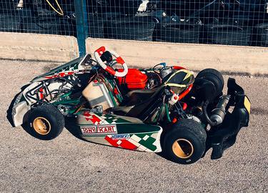 Telaio Tony Kart e motore 125cc Vortex lamellare, silenziatore in carbonio e pompa dell’acqua maggiorata Elto, tutto altamente preparato, allegerito e pronto pista.