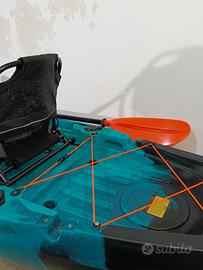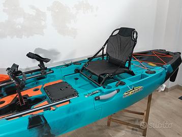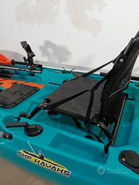 Fornito con sistema pedali, sedile alto in alluminio, pagaia, timone e portacanne girevole.