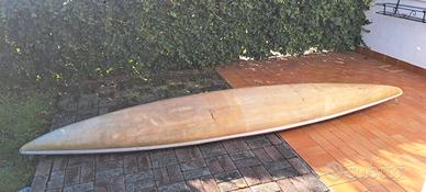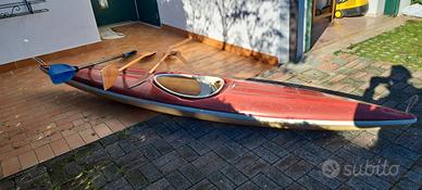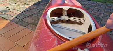Vecchio kayak super funzionante. Tre pagaie,salvagente interno per galleggiamento e base per piedi regolabile.
