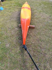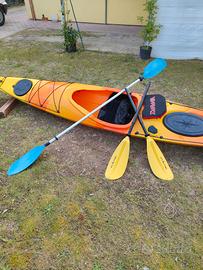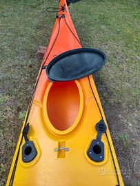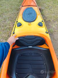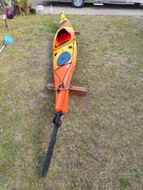 Kayak touring con timone, modello BAYWATCH di Atlantis. Usato solo 5 volte in 3 anni, sempre risciacquato con acqua dolce e tenuto appeso in garage. Vendo per inutilizzo e per liberare spazio. Costruito in polietilene ad alta densità, lunghezza 4,50mt, larghezza 55cm, peso 26kg, portata massima 120kg. Adatto alla pesca grazie ai due porta canne integrati. Schienale e poggiapiedi regolabili lo rendono molto comodo anche per giri lunghi. Il kayak è molto veloce ma allo stesso tempo è stabile e maneggevole grazie al timone con comandi a pedale che si può ritirare per navigare su fondali bassi o per il trasporto. Kayak adatto (e testato) per il campeggio nautico grazie agli ampi gavoni. Vendo insieme agli accessori visibili in foto: cuscinetto seduta rialzato con ventose, pagaia smontabile, pagaia fissa leggera in alluminio. Prezzo poco trattabile, da nuovo costava più del doppio e le condizioni attuali sono ottime. Ritiro a mano, non spedisco.