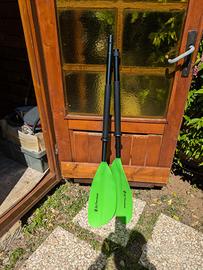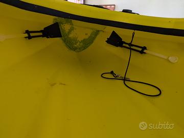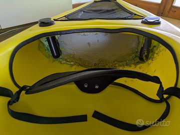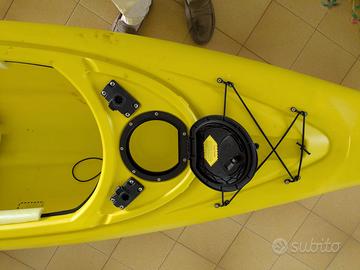 Modello Biz della Big Mama kayak, un kayak sit-in leggero e maneggevole, comprato come secondo kayak ed usato solo due volte. Modificato con aggiunta di 2 portacanne fissi dietro il seggiolino. Reso inaffondabile tramite realizzazione di un comparto stagno a prua ed uno a poppa. Ben accessoriato, con un Gavone di prua, seggiolino incorporato, puntapiedi regolabili, rete di poppa ed elastico di prua. La capacità di carico è di 125 kg. É predisposta di 2 portacanne orientabili a prua. Caratteristiche tecniche: Lunghezza: 305 cm Larghezza: 71 cm Altezza 34 cm. Misure pozzetto sono 90 x 52 cm. Capacità di carico: 125 kg. Peso: 17 kg. Dotazione della BIZ: Pagaia in alluminio, Seggiolino, Gavone: 1, Maniglia a prua: 1, maniglia di poppa: 1. Tappo di svuotamento condenza a poppa: 1. Predisposizione per portacanne orientabile. Elastico lega carichi a prua. Rete in nylon a poppa Nel prezzo sono anche compresi i due portacanna regolabili anteriori che ho dimenticato di fotografare ed anche un telo per coprire il kayak
