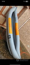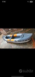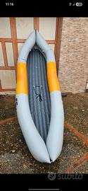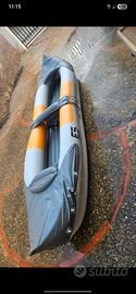 Kayak gonficabile con carico massimo 160 Kg e con 5 camere d'aria. Ha unadoppia pagaiache misura lunghezza 220 cm circa. Predisposto per montaggio a scatto, include sacca per il trasporto e sacca stagna (30x25 cm circa) per proteggere gli oggetti dagli schizzi d'acqua. Misura328 cmcirca (sgonfio).