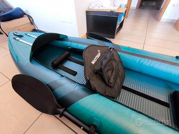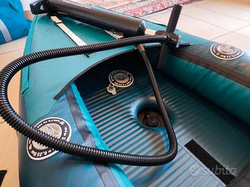 Kayak due posti con fondo dropstitch ad alta pressione (8 psi contro i 5 della concorrenza) lungo 410 cm e largo 85, peso massimo trasportabile 210 kg. Molto ben accessoriato: pompa manuale fino a 25 psi, due pagaie decenti, con i cucchiai ben rigidi a differenza di quelle dei giocattoli Intex, puntapiedi robusti e funzionali, 2 tasche in mesh rimovibili, due daisy chain nel cockpit per fissare oggetti (ad esempio la borraccia). Sedili con ampia tasca posteriore con cerniera. Zaino trasporto dotato di spallacci larghi e comodi e rotelle, se volete usarlo come trolley. Dotato di 2 pinne direzionali per prestazioni migliorate in presenza di vento, due portapacchi con cinghie regolabili, apribili e volendo anche asportabili. Ottime condizioni, usato solo due volte per girare due video per un canale youtube, condizioni pari al nuovo. Acquistato a Febbraio 2026 quindi ancora in garanzia fino a Febbraio 2028. Vendo perchè come potete vedere dalla foto ho altri kayak e finirei per non usarlo. Perfetto per belle gite al mare o al lago. Preferisco non spedire, meglio se venite a vederlo di persona.